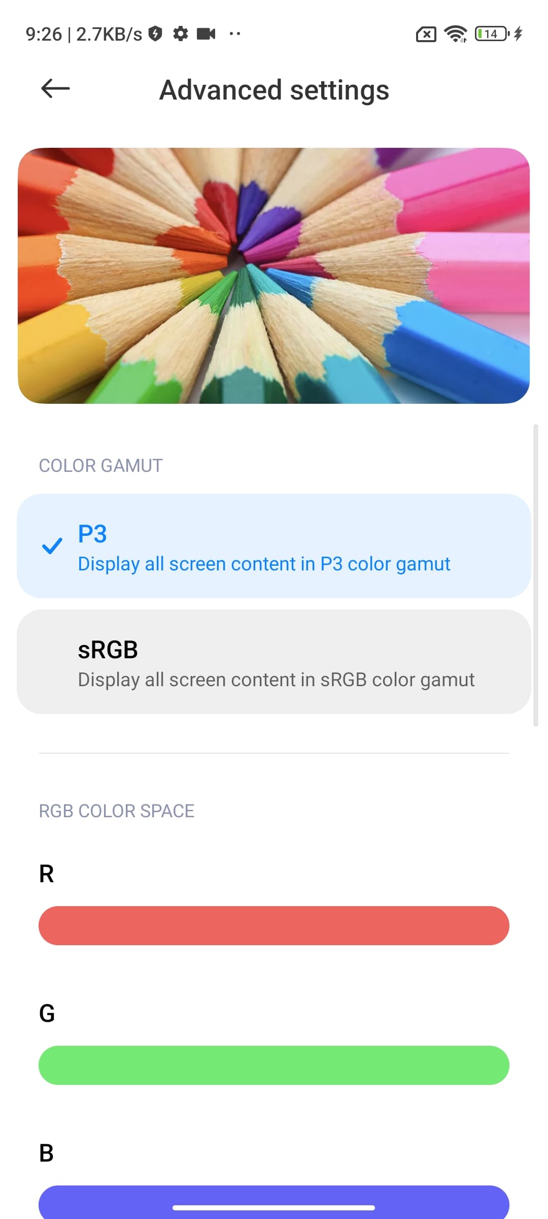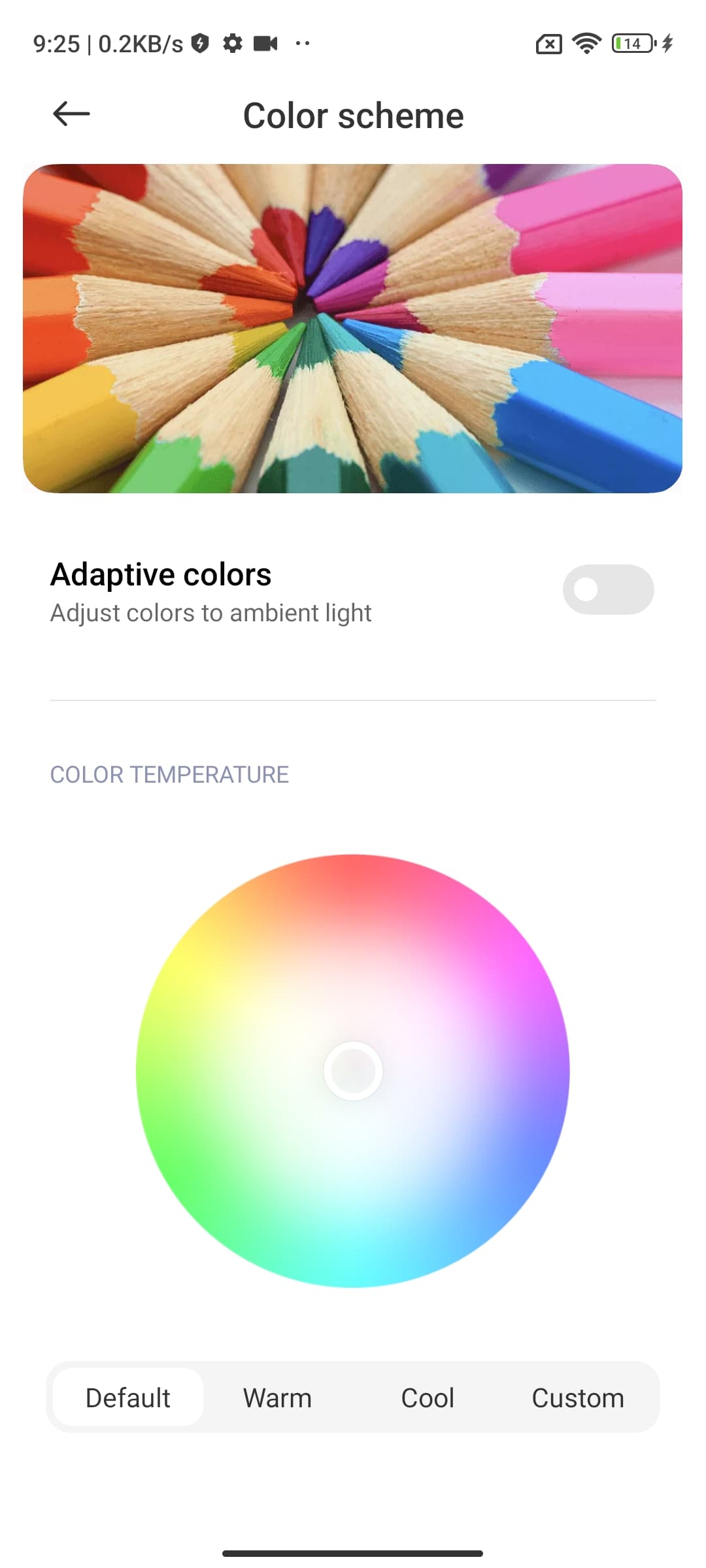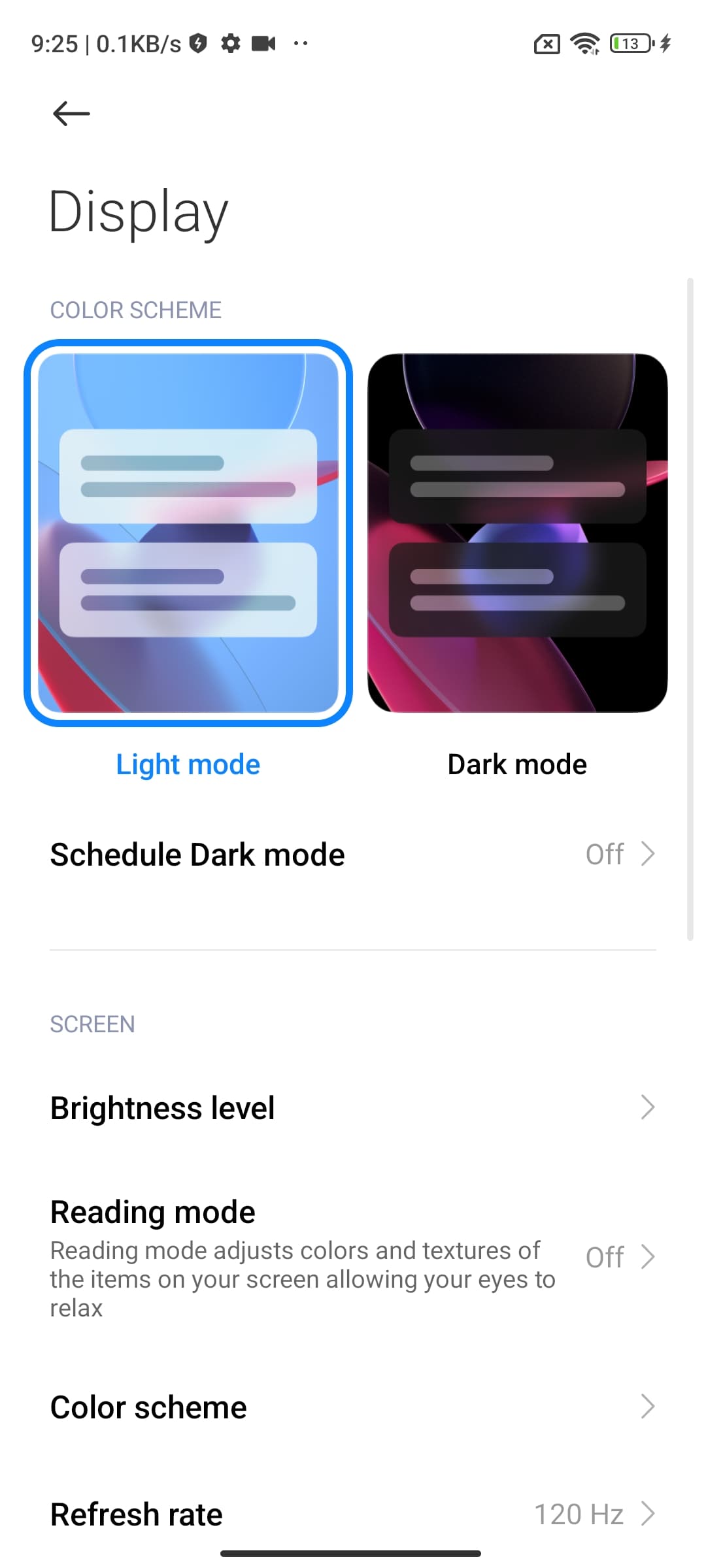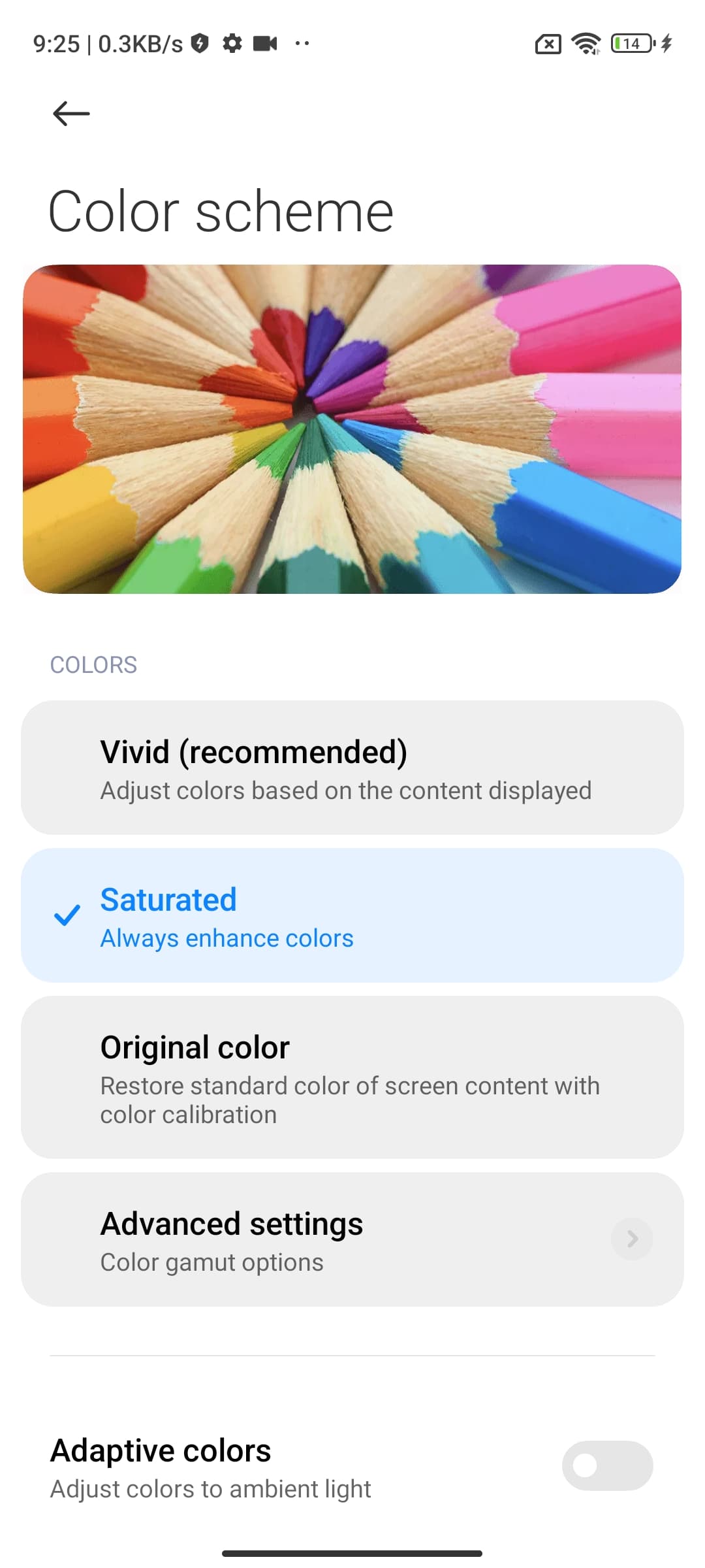 تنظیمات صفحهنمایش شیائومی ۱۲ لایت برای نشان دادن رنگها روی Vivid قرار گرفته است. در این حالت رنگها سفید و خاکستری کمی آبی به نظر میرسند.