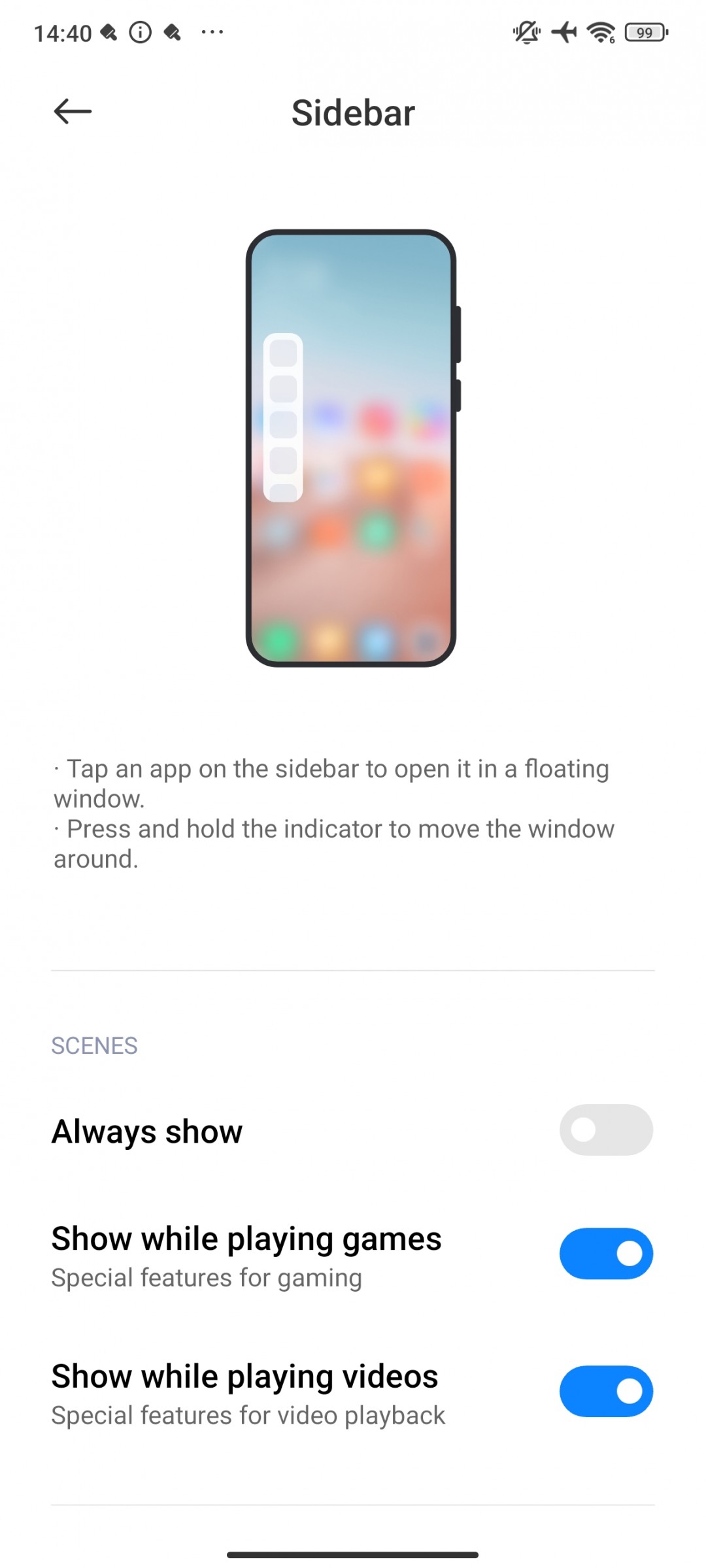 رابط کاربری MIUI14 تغییرات و ویژگیهای کاربردی زیادی را برای گوشیهای شیائومی به همراه داشت. یکی از ویژگیهای جالب توجه این محصول تغییرات در ساید بار آن است. این ساید بار بسته به برنامهای که در حال استفاده از آن هستید قابلیتهای متفاوتی را ارائه میکند. هنگام بازی نوار کناری تنظیمات فوری و مرتبط با بازی را برایتان باز میکند و در مقابل هنگام تماشای فیلم و سریال این نوار به جعبه ابزار ویدئو تبدیل میشود. برای مثال هنگام پخش ویدئو ویژگیهای مانند اسکرینشات، ضبط صفحه، ارسال محتوا و پخش ویدیو را در اختیارتان قرار میدهد. به این نکته توجه داشته باشید که برای فعال کردن این قابلیت باید برنامههایی که مجاز به استفاده از ساید بار هستند را از بخش تنظیمات مشخص کنید.