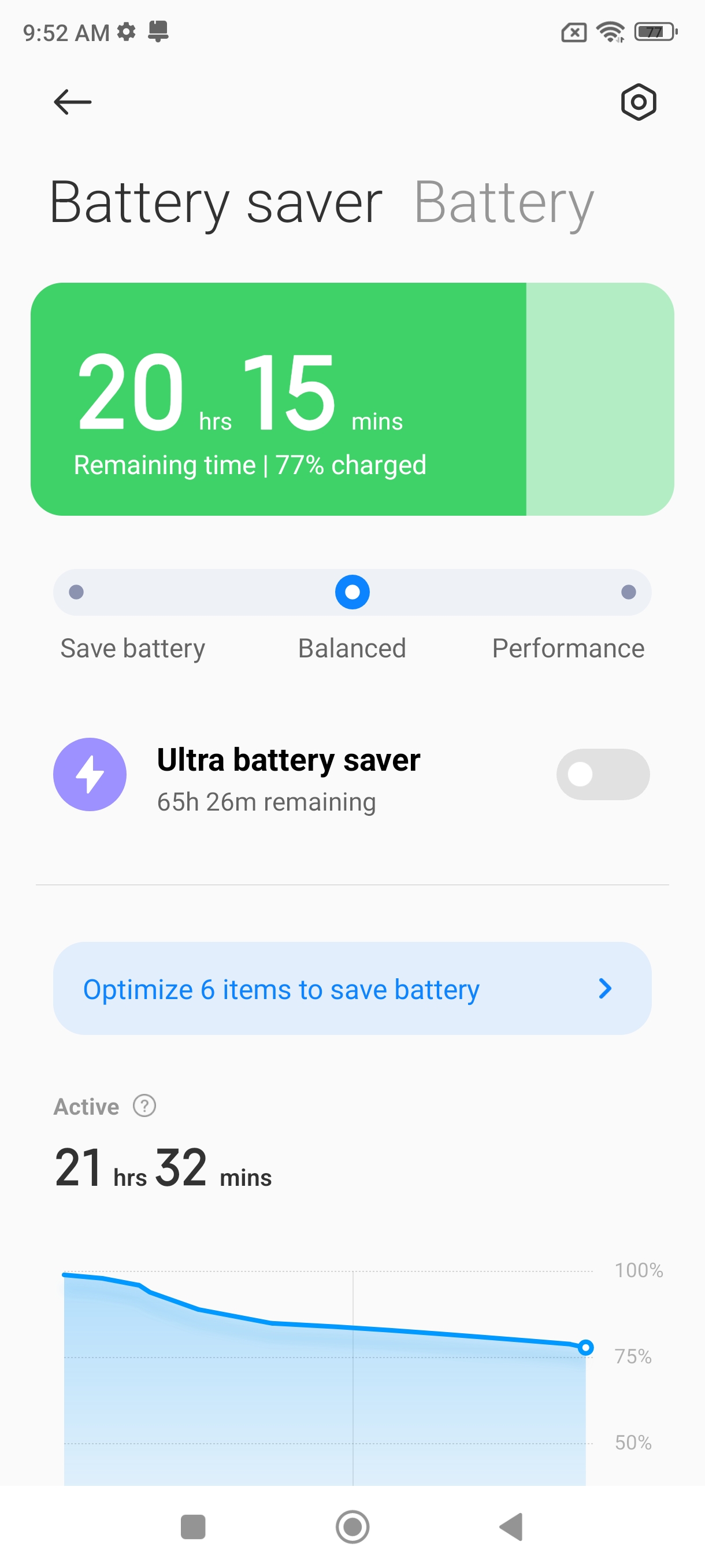 هنگامی که وارد بخش تنظیمات باتری میشوید سه حالت متفاوت برای عملکرد آن وجود دارد که میزان مصرف شارژ متفاوتی را در اختیارتان قرار میدهد. حالتهای Save Battery، Balanced و Performance در این بخش قرار دارند. حالت Performance بیشتری مصرف باتری را دارد و حالت Balance مصرف نرمال و معمولی در اختیارتان قرار میدهد؛ همچنین حالت Save battery با غیر فعال کردن برخی ویژگیها در مصرف بهتر باتری شما را کمک میکند. در پایین این تنظیمات گزینه جداگانهای به نام Ultra battery Saver قرار دارد که در موارد ضروری کارامد است. این گزینه تمام فعالیتهای گوشی را محدود میکند و قابلیتهالی جزئی در اختیارتان قرار میدهد. در مواردی که باتری گوشی شما در کمترین حالت ممکن قرار دارد و نمیخواهید خاموش شود میتوانید گوشی را روی این حالت قرار دهید.