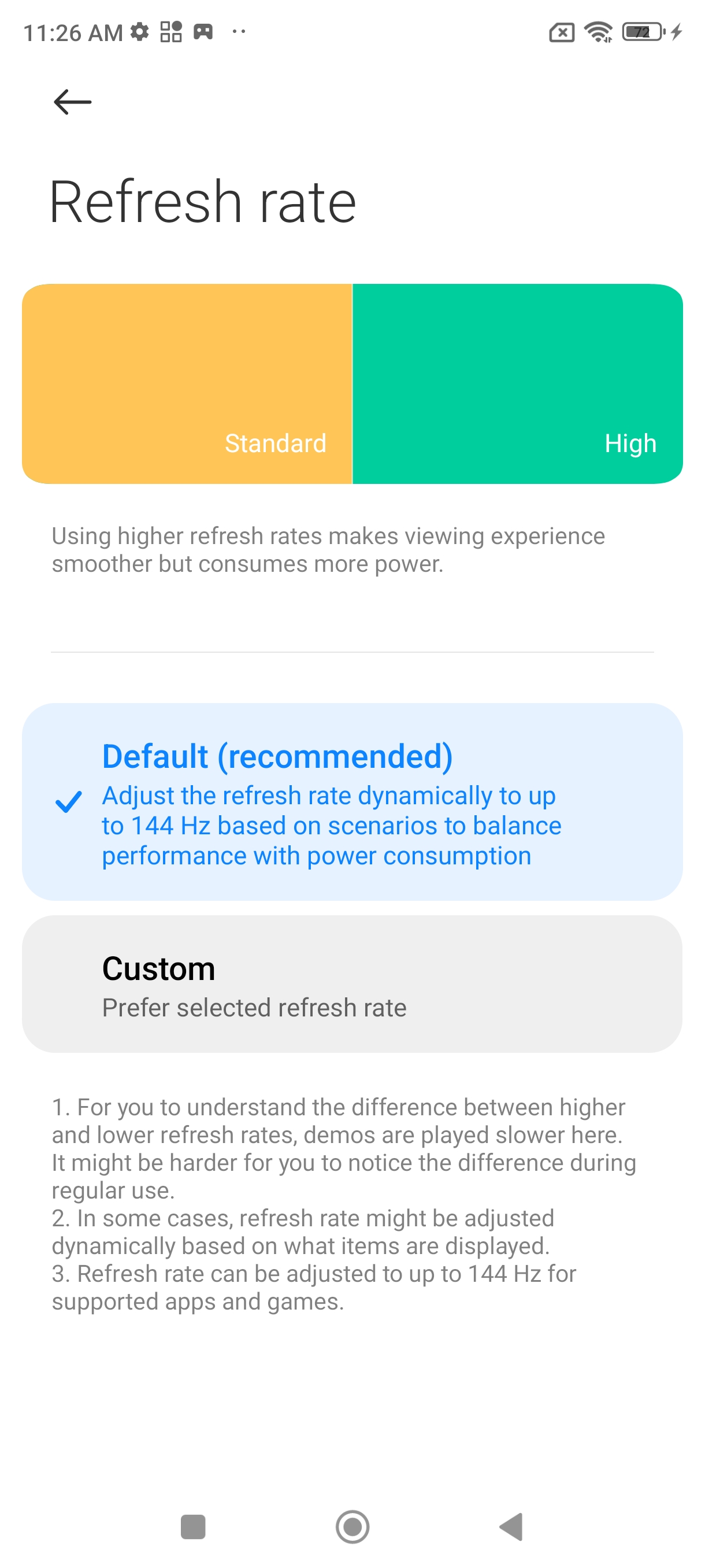 در این بخش گزینه دیگری برای تنظیم نرخ تازهسازی دستگاه وجود دارد. با انتخاب این گزینه میتوانید به دو حالت Default و Custom دسترسی پیدا کنید. حالت Defualt با توجه به محتوای در حال پخش و برنامهای که از آن استفاده میکنید نرخ تازه سازی را تنظیم میکند و حالت Custom نیز دو نرخ تازهسازی 60 هرتز و 144 هرتز را در اختیارتان قرار میدهد. هنگامی که گزینه Custom را انتخاب میکنید در پایین آن برنامههایی که مجوز استفاده از نرخ تازهسازی 144 هرتز دارند را مشاهده خواهید کرد و در صورتی که نیازی به این نرخ تازهسازی نیست برای مصرف بهینهتر باتری بهتر است آن را خاموش کنید. تنظیمات Dark Mode، تنظیم میزان روشنایی صفحهنمایش، تنظیمات فونت و اندازه متن از دیگر گزینههایی هستند که در بخش تنظیمات صفحهنمایش این محصول به آن دسترسی پیدا خواهید کرد.