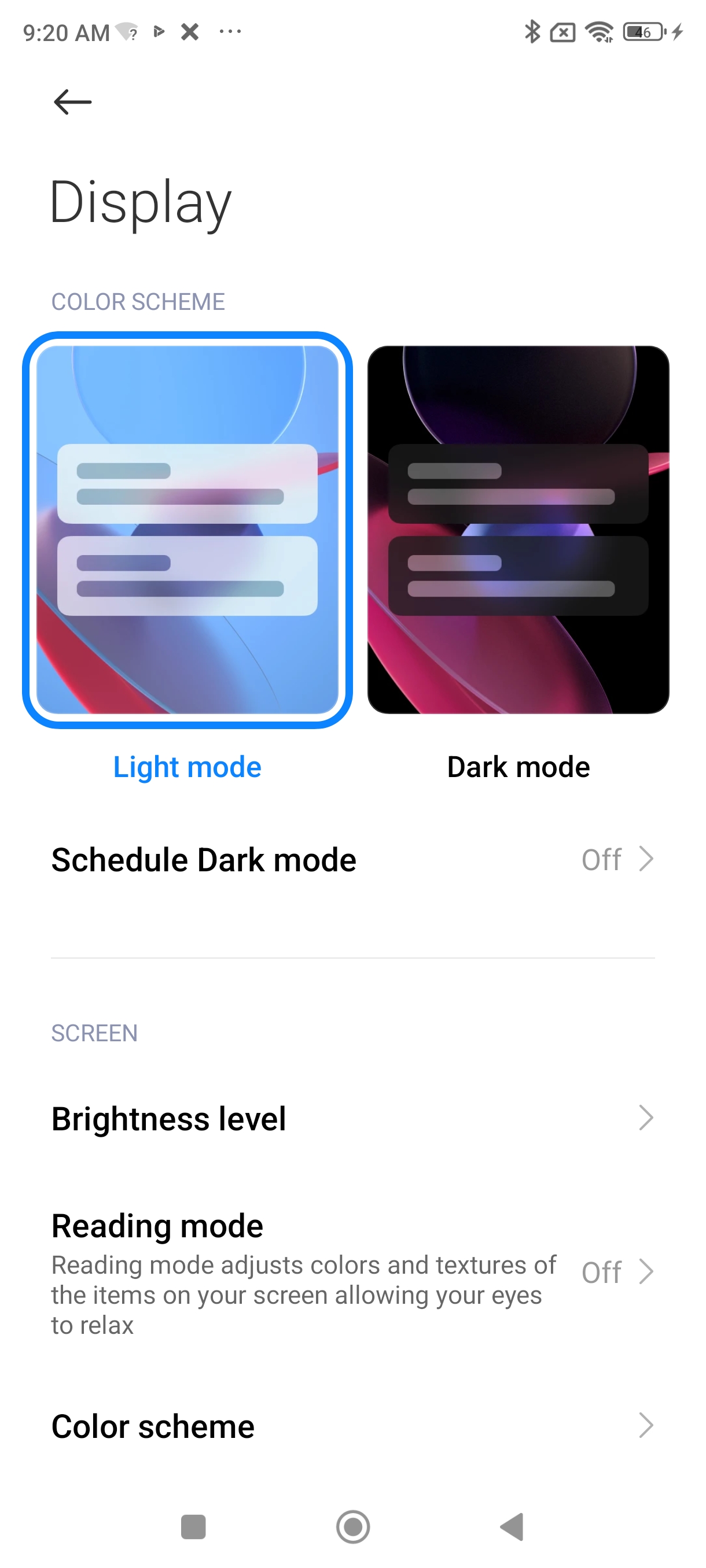 میزان روشنایی که شیائومی برای صفحهنمایش این گوشی قرار داده 1200 نیت است که عدد قابل توجهی محسوب میشود و به راحتی به شما امکان استفاده زیر نور خورشید را میدهد. این صفحهنمایش از 68 میلیارد رنگ، فناوری HDR10+، فناوری Dolby Vision، طیف رنگی DCI-P3 و قابلیت Reading Mode پشتیبانی میکند. هنگامی که وارد تنظیمات صفحهنمایش این گوشی میشوید ابتدا دو گزینه پیش رویتان قرار دارد که میتوانید با استفاده از آن گوشی را روی حالت Dark Mode یا Light Mode بگذارید؛ همچنین در قسمت پایینی گزینهای قرار داده شده تا این قابلیت را روی حالت خودکار بگذارید و بین این دو حالت در زمانهای متفاوت جا به جا شوید.