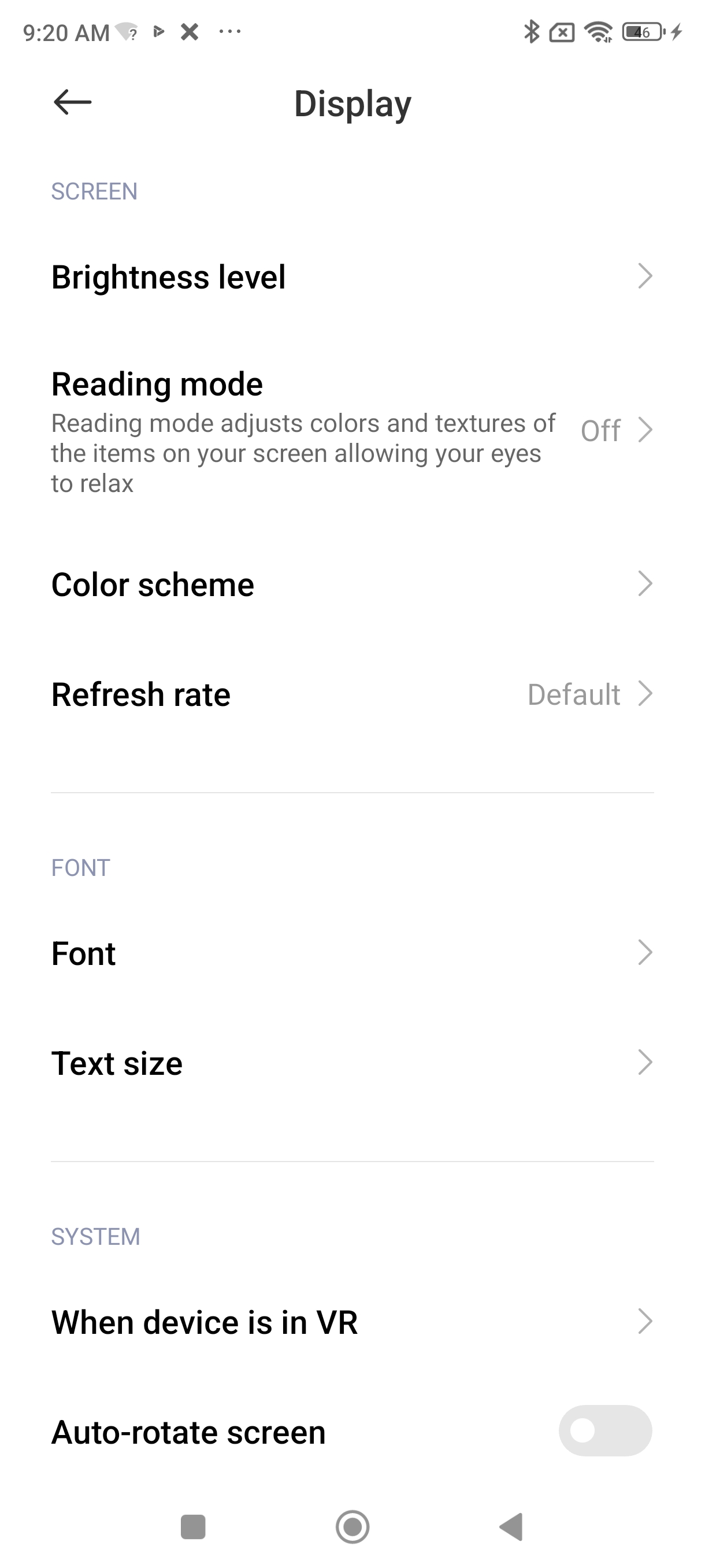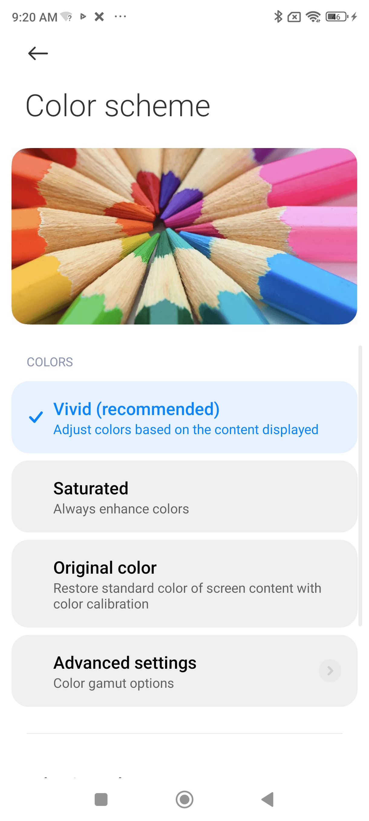 کمی پایین تر نیز تنظیمات مرتبط به میزان روشنایی و فعال یا غیر فعال کردن حالت Reading Mode قرار گرفته است. هنگامی که گوشی را روی حالتی بگذارید که رنگها و نوشتهها در حالتی قرار گیرند که با استفاده طولانی اذیت و خستگی برای چشمها نداشته باشند. رنگهای صفحه نمایش به صورت پیش فرض روی حالت Vivid قرار گرفته و Saturated، Orginal Color از دیگر حالتهایی هستند که برای نمایش حالتهای مختلف رنگی صفحهنمایش میتوانید از آن استفاده کنید. با مراجعه به Advanced Settings هم میتوانید تنظمیات نمایش رنگ را به شکلی که دوست دارید تغییر دهید.
