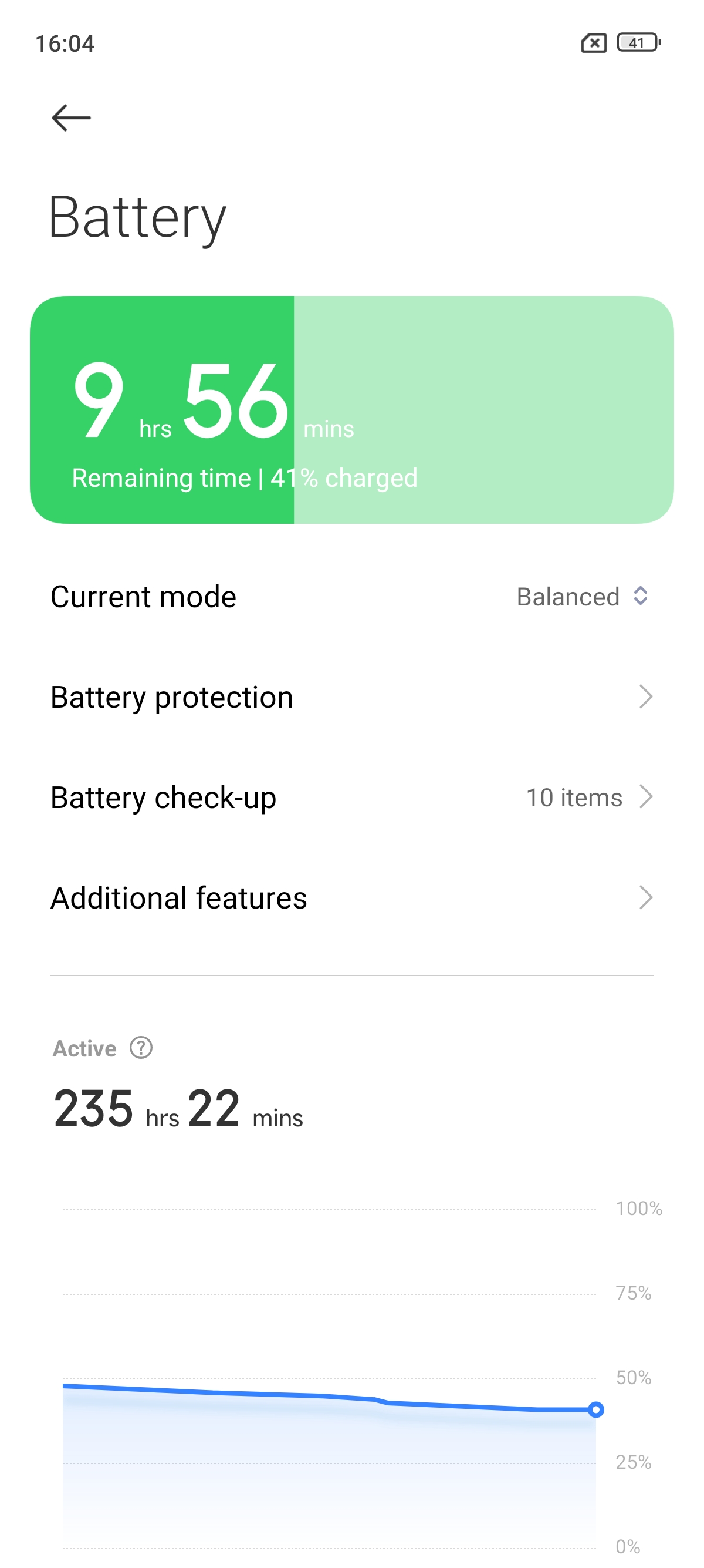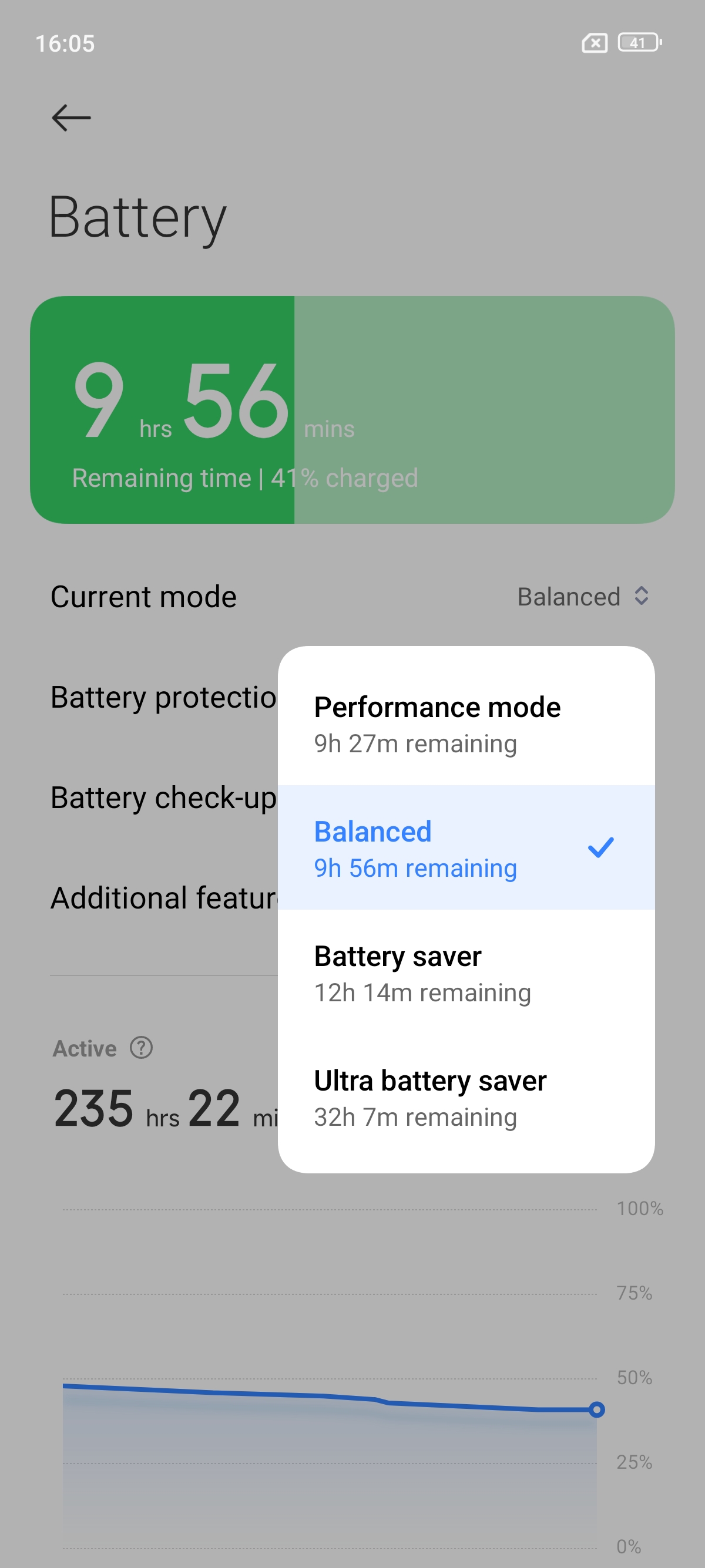 هنگامی که وارد تنظیمات و بخش Battery میشوید چهار گزینه مصرف باتری در اختیارتان قرار میگیرد. گزینه اول Performance Mode است که از تمامی امکانات گوشی با بالاترین کیفیت استفاده میکند و مصرف باتری بالاتری نیز دارد. گزینه دوم Balanced است که مصرف معمولی تری دارد و از برخی ویژگیها چشم پوشی میکند تا مصرف باتری مناسبتری داشته باشد. بخش Battery Saver نیز برخی قابلیتها محدود میشود تا مصرف باتری بهینهتری داشته باشید. آخرین گزینه Ultra Battery saver است که برای موارد ضروری کاربرد دارد. این گزینه اکثر قابلیتهای گوشی را غیر فعال میکند و تنها برخی ویژگیها مانند تماس و ارسال پیام را فعال نگه میدارد تا در مواقعی که دسترسی به شارژر ندارید گوشی مدت زمان بیشتری شارژ نگه دارد.