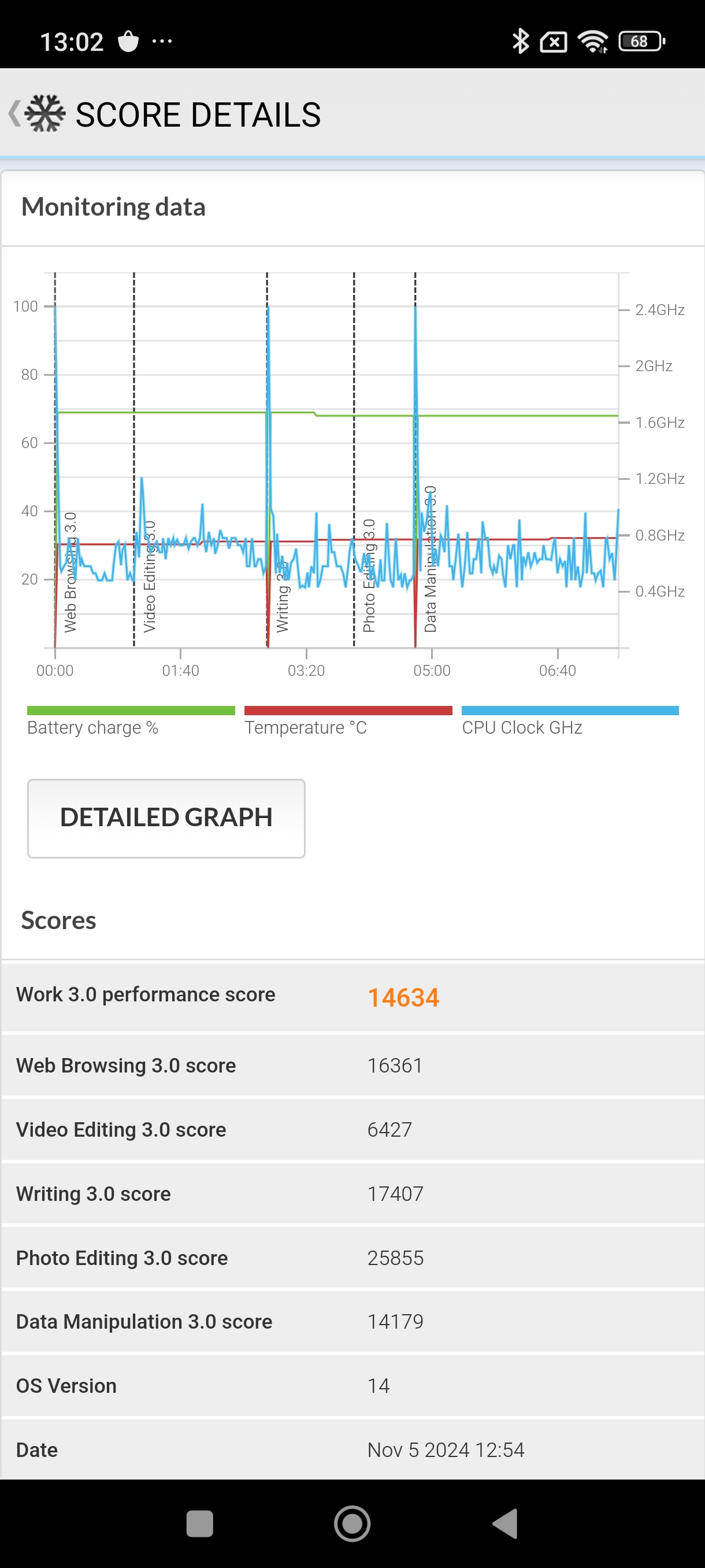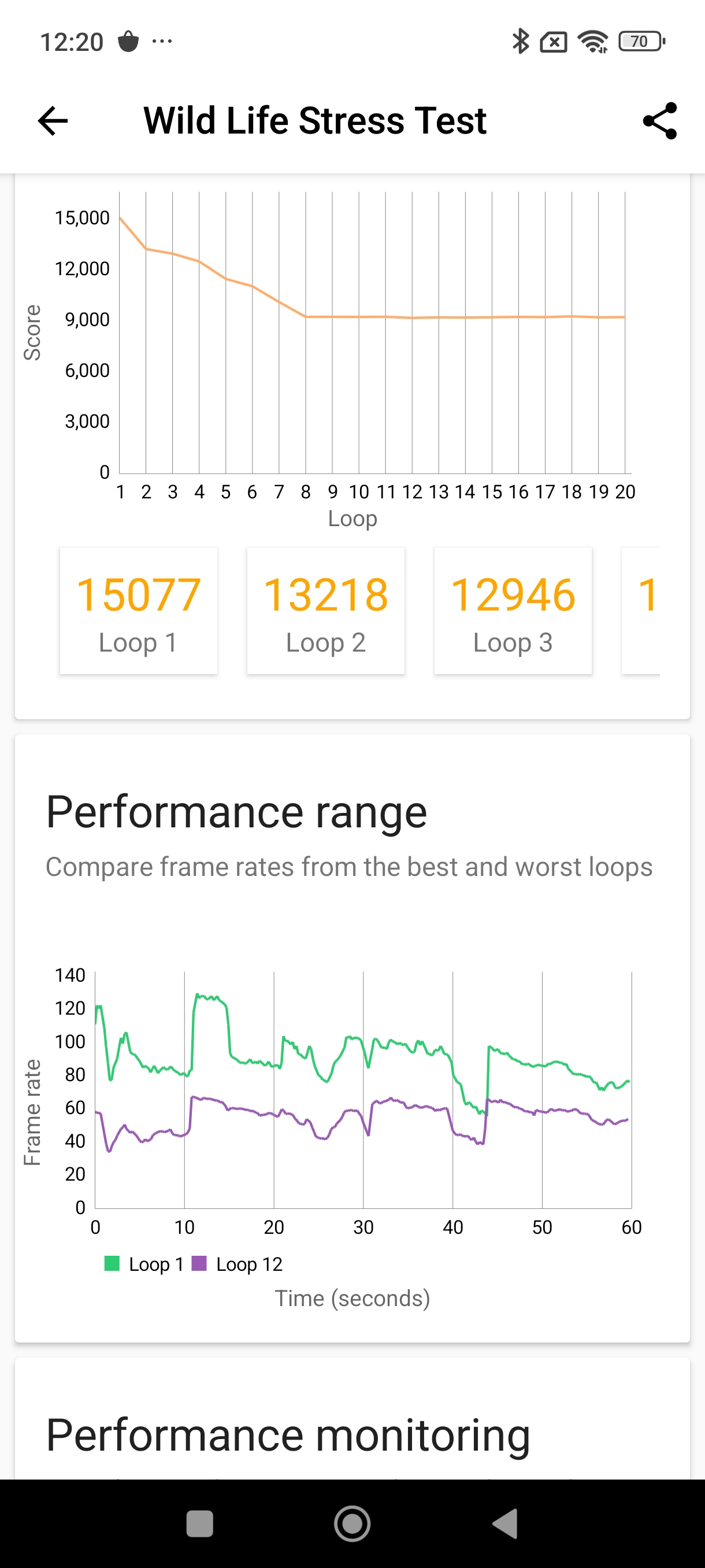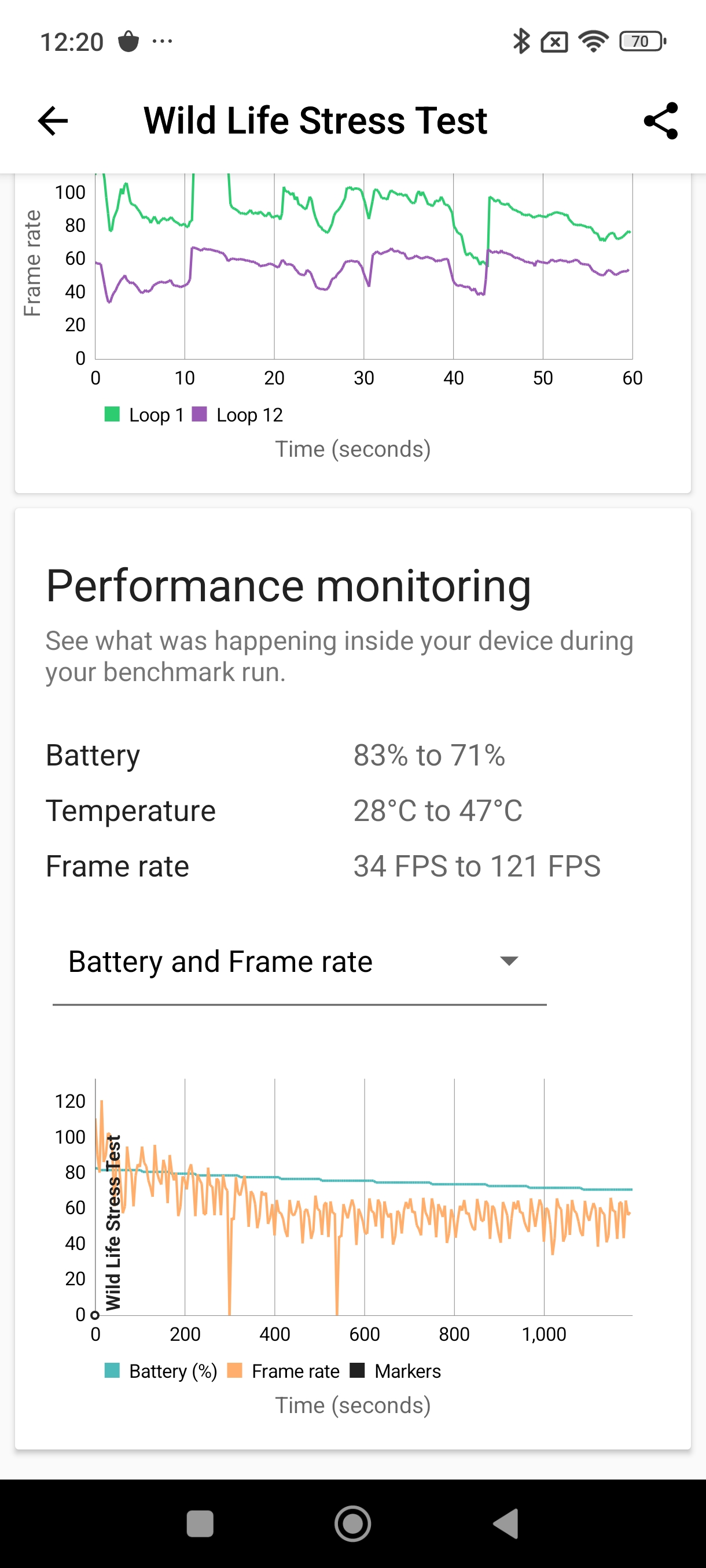 در تست Wild Life Stress Test برنامه 3D mark شاهد پایداری 60.8 درصدی تراشه هستیم که برای این تراشه بسیار پایین است، چرا که همین تست در گوشیهای رده پایینتری مانند Redmi Note 13 Pro با پایداری بالاتری برای تراشه به پایان رسیده است، البته باز هم پایداری تراشه این گوشی به نسبت رقیب سامسونگیاش کمی بهتر است که در بررسی اس ۲۴ اف ای با آن مواجه شدیم.