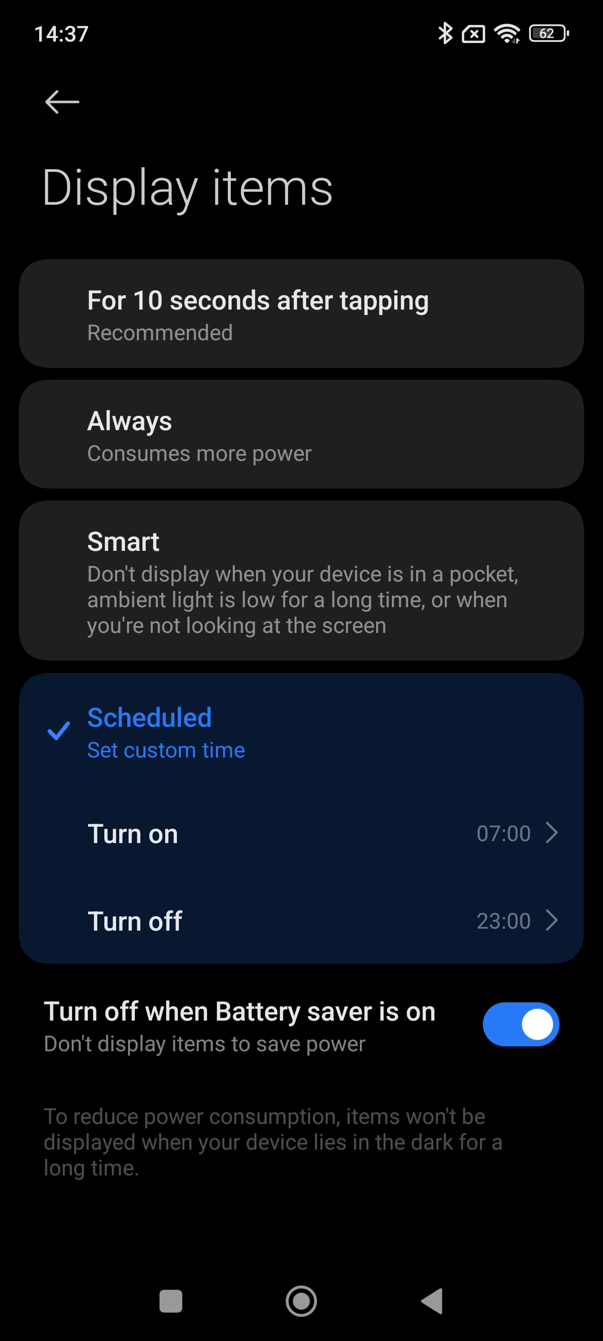 در پایان همین صفحه هم با فعال کردن Turn off when Battery saver is on میتوانید به گوشی فرمان دهید که به ازای خاموش شدن صفحه نمایش در حالتی که در ذخیره باتری قرار دارید، حالت Always on Display جهت کم نشدن شارژ باتری کاهش پیدا کند.