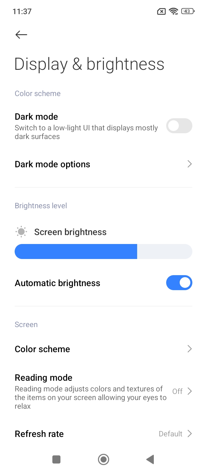 میزان روشنایی redmi 14 c از 450 نیت تا 600 نیت تغییر میکند که برای استفاده در نور روز و تاریکی شب، میزان نوری کافی و راضی کننده به حساب میآید، البته اگر در نور مستقیم آفتاب به استفاده از گوشی بپردازید، ممکن است کمی نیاز به جابهجایی داشته باشید که این اتفاق به نسبت قیمت گوشی کاملا طبیعی است. شما میتوانید برای تنظیم روشنایی صفحه نمایش از قسمت Display در Settings اقدام کرده و از بین 2 حالت تغییر میزان روشنایی به صورت دستی با اسلایدر و اتوماتیک یکی را انتخاب کنید. پیشنهاد میشود که در نورهای زیاد از اسلایدر دستی استفاده کنید.