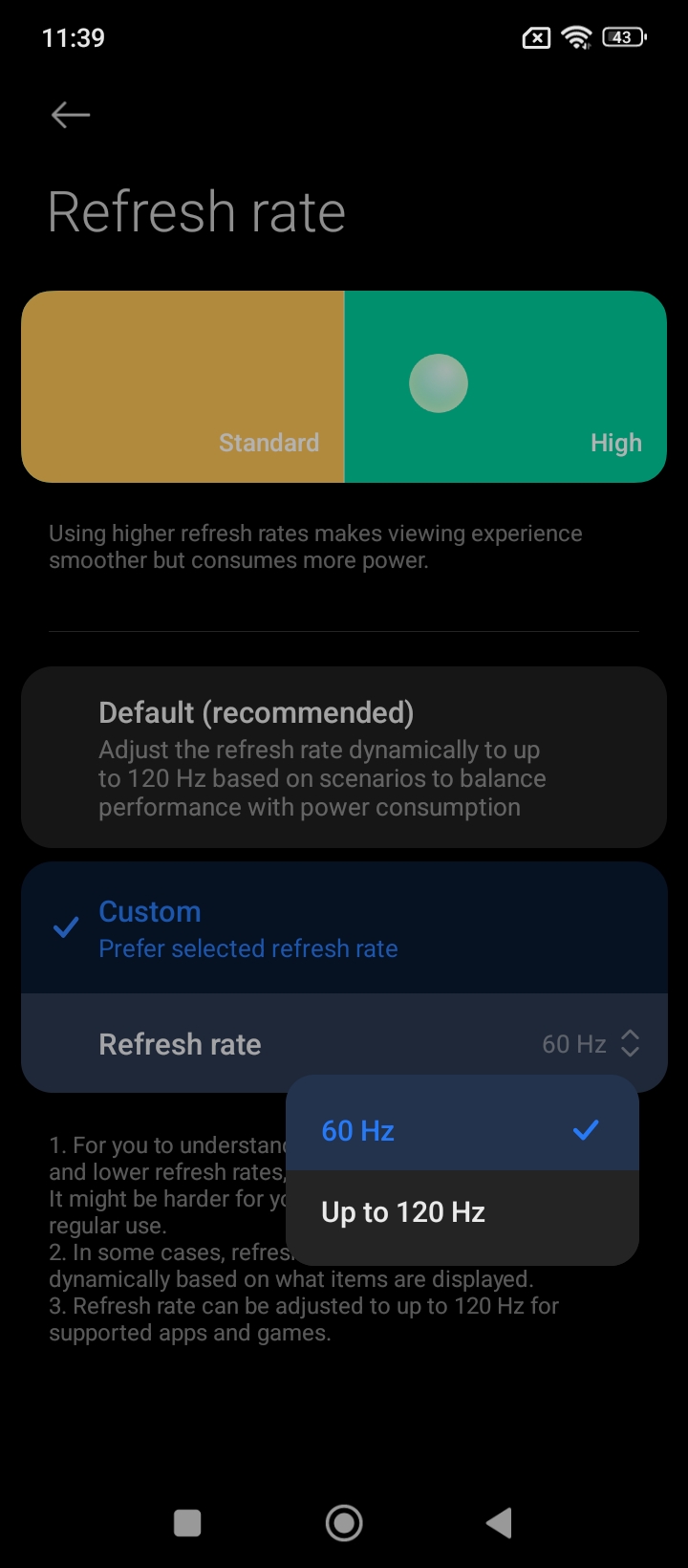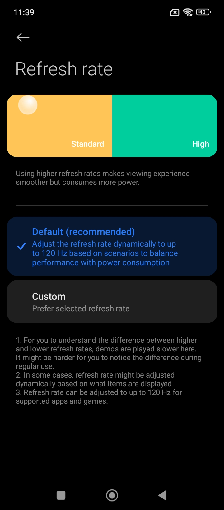 نرخ نوسازی صفحه نمایش ردمی 14 سی حداقل 60 هرتز و حداکثر 120 هرتز است که شما میتوانید با قرار دادن آن روی حالت Default که به معنای پایه است، از تغییر رفرش ریت پایه گوشی استفاده کنید، این حالت میتواند در مصرف باتری گوشی کمک شایانی به شما کند؛ در صورتیکه رفرش ریت را روی حالت Custom قرار دهید، میتوانید بین 2 حالت 60 Hz و 120 Hz به شکل دستی تغییر ایجاد کنید. در مجموع این بخش هم در لیست نقاط ضعف گوشی ردمی 14c قرار نمیگیرد که با توجه به قیمت پایین گوشی، نقطهای امیدبخش است.