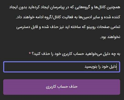 بعد از گذراندن مراحل فوق حساب کاربریتان به صورت دائم حذف میشود و دیگر حسابی با شماره و مشخصات شما وجود نخواهد داشت. لازم به ذکر است که نوع سیستم عامل گوشی روی انجام مراحل فوق تاثیری ندارد و دیلیت اکانت روبیکا ایفون دقیقا همانند مراحل فوق انجام میشود. توجه داشته باشید که بعد از دلیت اکانت روبیکا امکان دسترسی به هیچ گروه، پیام و کانالی نخواهید داشت و تمامی اطلاعات موجود در برنامه پاک میشوند؛ بنابراین قبل از دیلیت اکانت روبیکا اطلاعات ضروری را از در محلی دیگر از گوشی موبایل ذخیره کنید.