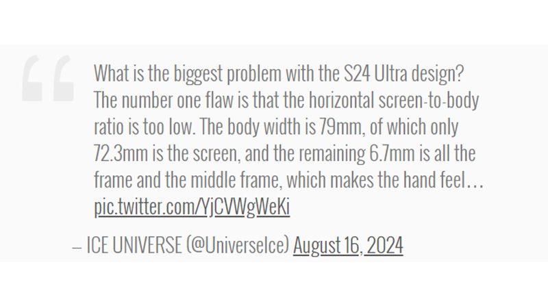 در حقیقت منتقدان گوشی Galaxy S24 Ultra از زمان معرفی آن تا به امروز (سه ماهه سوم 2024) میگویند که شاید این گوشی کهکشانی پرچمدار یکی از بهترین گوشیهای هوشمند موجود در بازار باشد، اما در دست گرفتن آن واقعاً لذت بخش نیست. برخی دیگر هم میگویند که لبههای نوک تیز آن کف دستشان را سوراخ میکند که البته این اغراقی بیش نیست، اما بهرحال نقدی است که این روزها به گوش میرسد. شاید جالب باشد، اما در این میان هم افرادی هستند که اصلا موافق و طرفدار قابهای بزرگ نیستند و اعتقاد دارند که طراحی گوشی نباید بهگونهای باشد که گوشی عریضتر از حد معمول نشان داده شود.