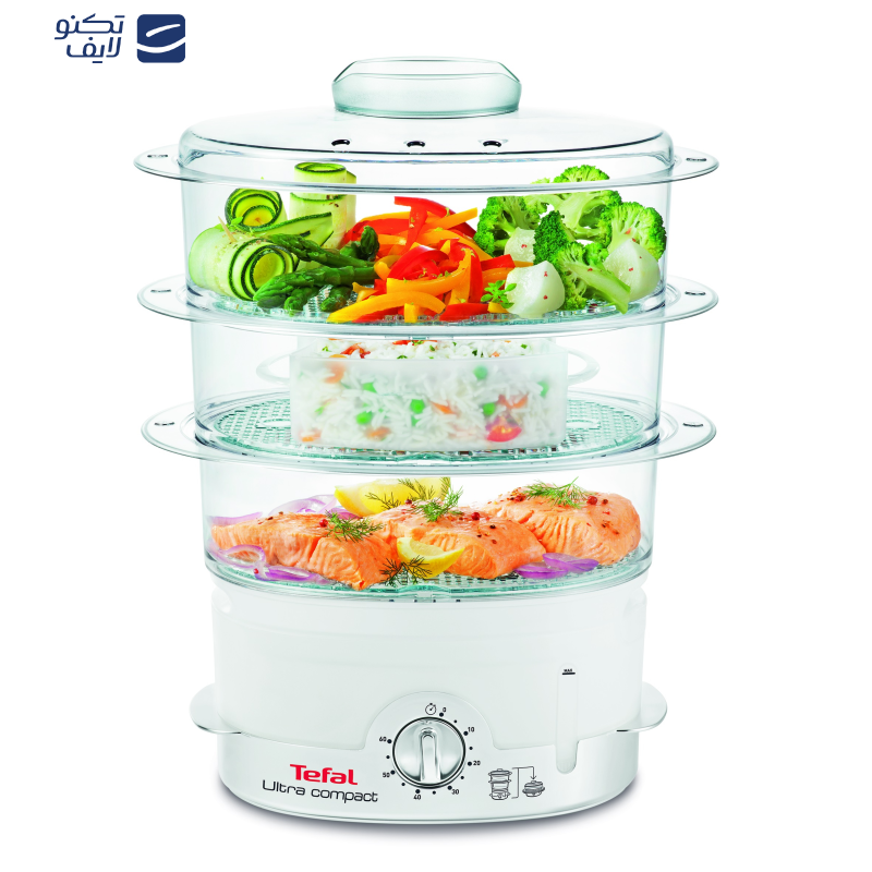 بخار پز سه طبقه تفال، توان مصرفی ۹۰۰ وات، دارای سه طبقه از جنس طلق شفاف، با قابلیت اضافه کردن آب در حین استفاده از دستگاه بدون نیاز به برداشته شدن طبقات، دارای ظرف مخصوص بخار پز کردن دانه های ریز (برنج، ذرت، حبوبات و …)، دارای تایمر ۴۰ دقیقه ای، قطع خودکار دستگاه در زمان بی آبی، قابلیت شستشو طبقات در ماشین ظرفشویی، نمایشگر میزان آب دستگاه، طراحی و مهندسی محصول در کشور فرانسه مونتاژ نهایی در کشور چین