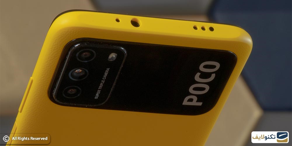 قاب پشتی گوشی هم که پلاستیکی است، کمی خمیده طراحی شده تا کاربران راحتتر بتوانند گوشی را به دست بگیرند. همانطور که گفتیم قاب پشتی بافتی چرممانند دارد که باعث شده حس بهتری به کاربران منتقل شود. قاب گوشی اثر انگشت را به خود جذب میکند، اما این موضوع روی مدل زرد رنگ قابل دید نیست و بیشتر روی مدل مشکی رنگ دیده میشود. قاب پشتی پوکو M3 میزبان ماژول دوربین بزرگی است که سه دوربین و فلش LED را داخل آن مشاهده میکنید. روی این ماژول دوربین لوگو Poco هم دیده میشود.