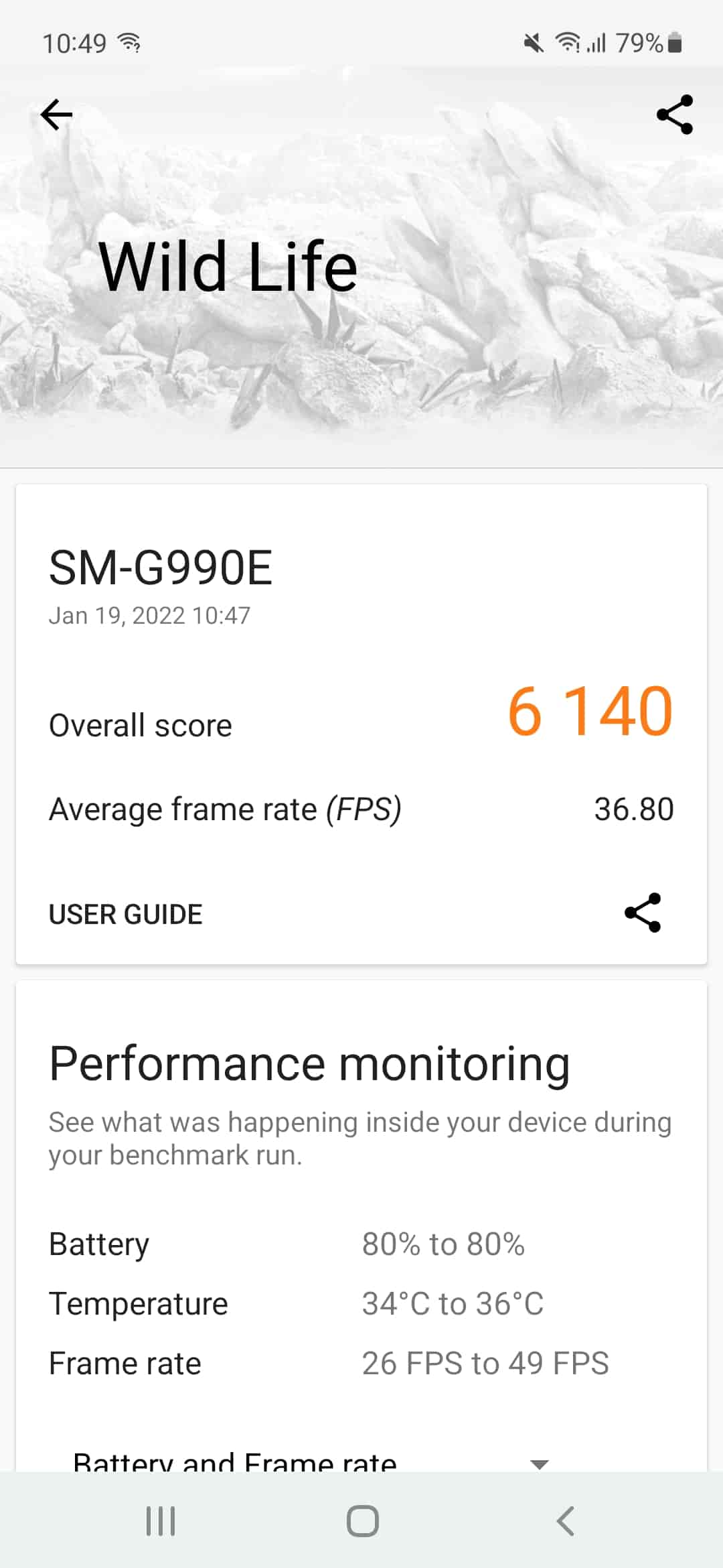گلکسی S21 FE عملکرد مطلوبی نیز در بنچمارک 3DMark داشت. به این صورت که از آزمون Wild Life توانست امتیاز ۶۱۴۰ را به دست آورد و آزمون را با فریم ریت متوسط ۳۶.۸ فریم بر ثانیه به پایان برساند. در آزمون PCMark نیز به سراغ بررسی عملکرد محصول شرکت کرهای رفتیم. گلکسی S21 FE توانست امتیاز مجموع ۱۴۴۷۹ را به دست آورد. در آخرین بنچمارک از GFXBench کمک گرفتهایم که شامل آزمونهای مختلف میشود، اما ما تنها سه آزمون را بررسی کردهایم که در ادامه به نتایج به دست آمده خواهیم پرداخت. گوشی S21 FE در آزمون Aztech Ruins FHD توانسته به متوسط فریم ریت ۷۷ فریم بر ثانیه در آزمون Manhattan 3.1 FHD به متوسط فریم ریت ۱۰۹ فریم بر ثانیه و در آزمون Car Racing FHD به متوسط فریم ریت ۶۲ فریم بر ثانیه برسد.