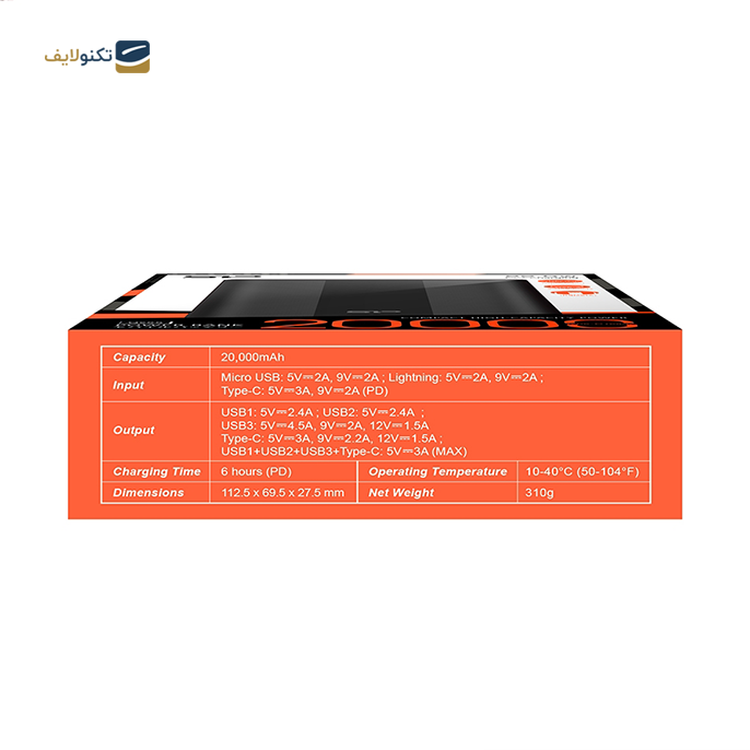 پاور بانک سیلیکون پاور مدل qs55 به باتریای با ظرفیت 20000 میلیآمپر ساعت (mAh) مجهز شده که در صورت داشتن شارژ کامل، این امکان را به کاربر میدهد تا دستگاههای مختلف را چندین بار شارژ کند. روی لبه پایینی این پاوربانک پورتهای ورودی و خروجی قرار گرفتهاند که شما میتوانید به دلیل داشتن 3 درگاه ورودی و 3 درگاه خروجی؛ گوشی و سایر دستگاهها را به طور همزمان شارژ کنید. برای پورت ورودی این پاوربانک درگاههای Micro USB، USB Type-C و لایتنینگ در نظر گرفته شده و برای پورت خروجی هم 3 درگاه USB Type-A و یک درگاه مشترک تایپ سی قرار داده شده است. لازم به ذکر است که این پاوربانک از تکنولوژی شارژ سریع Power Delivery پشتیبانی میکند که به کاربران اجازه میدهد تا دستگاههای خود را به سرعت شارژ کنند. توان خروجی کلی پاور بانک سیلیکون پاور qs55 برابر با 22.5 وات است که میان درگاههای خروجی تقسیم میشود.